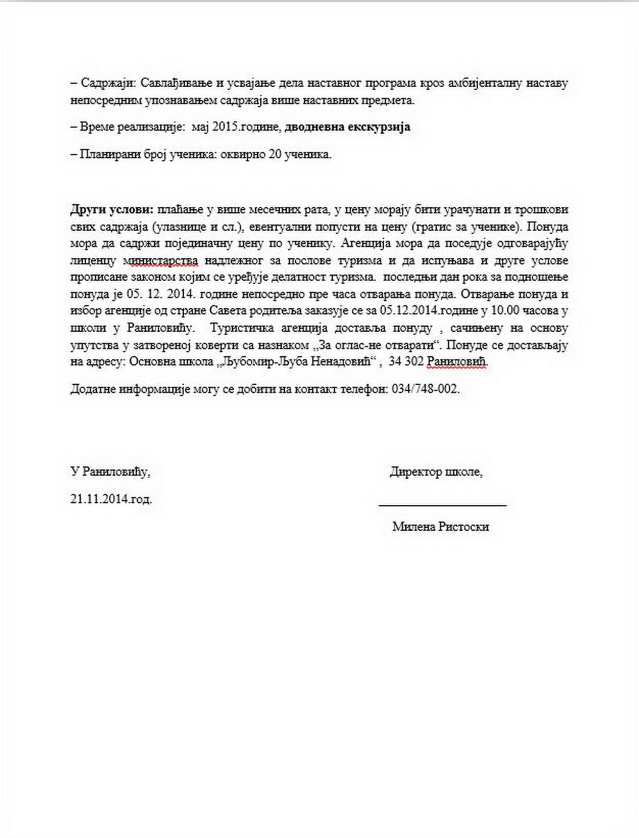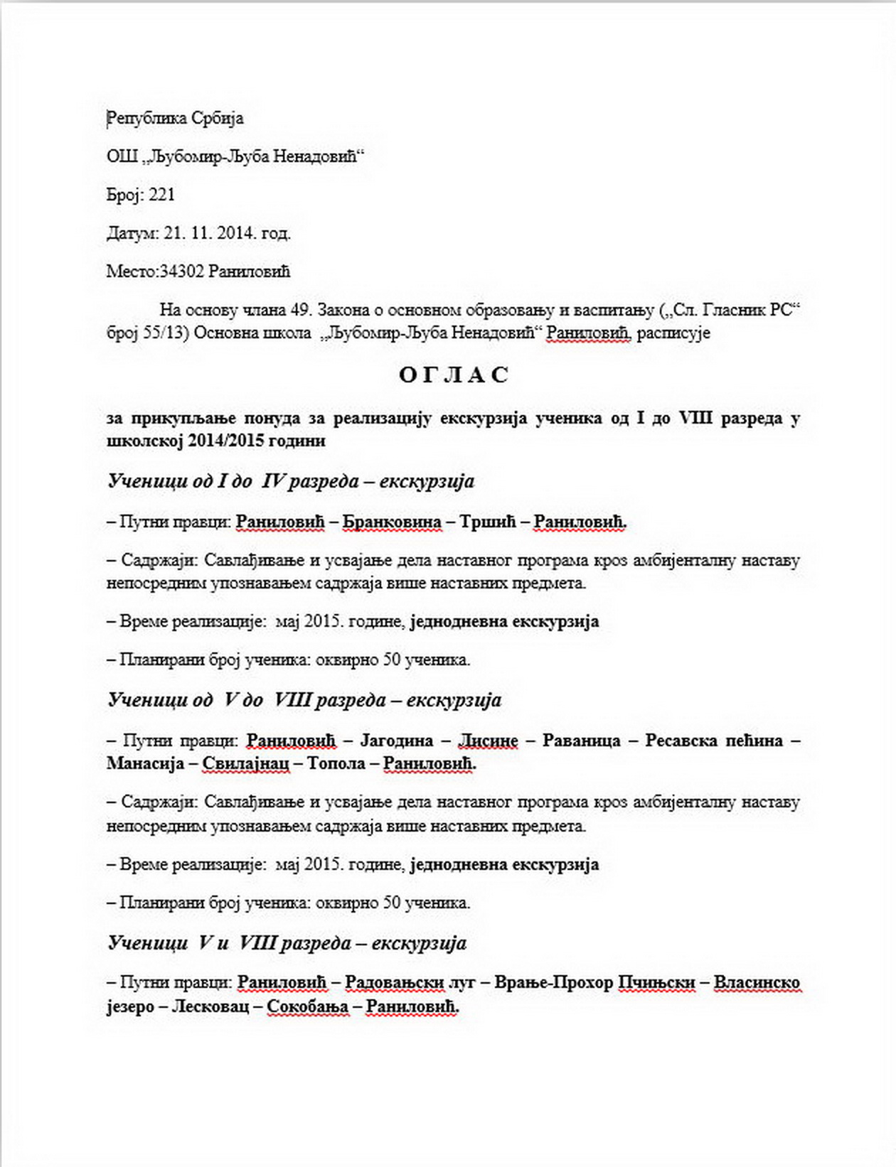 Оглас за екскурзије за школску 2014/15. 29/11/2014 Огласи Подели: Print (Opens in new window) Print Share on X (Opens in new window) X Share on Facebook (Opens in new window) Facebook Share on WhatsApp (Opens in new window) WhatsApp Кретање чланка Previous Previous post: Светски дан сећања на жртве саобраћајних незгодаNext Next post: Оглас за екскурзије