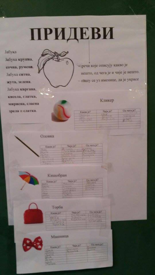 Групним радом и радом у паровима ученици су стицали знања о придевима. За мотивацију је коришћена песма Јабука са циљем да ученици уоче све речи којима је описана јабука. У главном делу часа ученици су са другом из клупе описивали предмете са слике. После презентације урађеног ученици су самостално састављали оглас (изгубљено-нађено; купујем-продајем) уз коришћење описних придева.